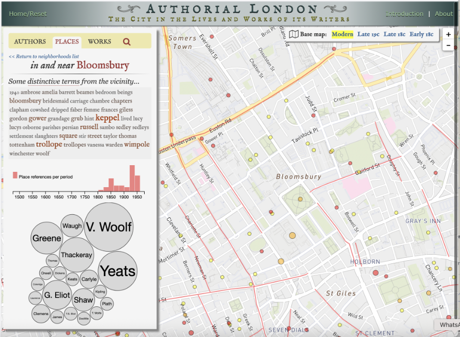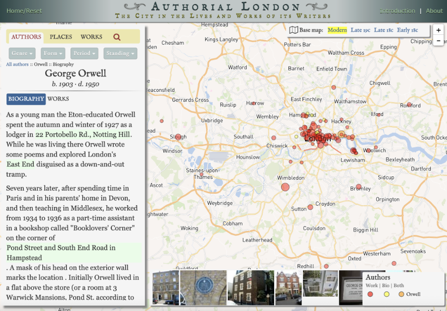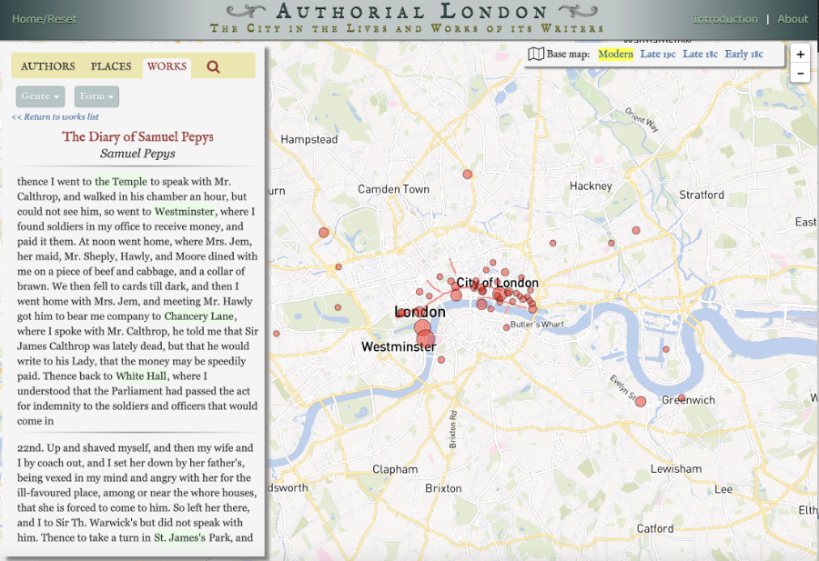Authorial London is a digital literary geography project that compiles and maps references to places within London found in works by writers who lived there. The site currently includes roughly 1,600 passages from 193 works written between the 14th and 20th centuries by 47 authors from 12 literary communities. Users can explore the corpus from literary, geographical, and biographical perspectives across dimensions such as genre, form, period, social standing, and neighborhood.