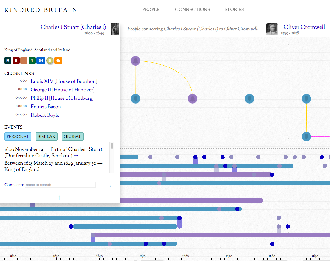 Kindred Britain was an ambitious digital humanities project that visualizes connections among nearly 30,000 individuals in British cultural history, reconstructing family relationships stretching across centuries. Conceived and led by English professor Nicholas Jenkins, and later developed extensively by Elijah Meeks and collaborators, the final project combines a richly curated biographical dataset with sophisticated network visualizations, interactive timelines, and narrative essays that explore patterns of kinship in British society.