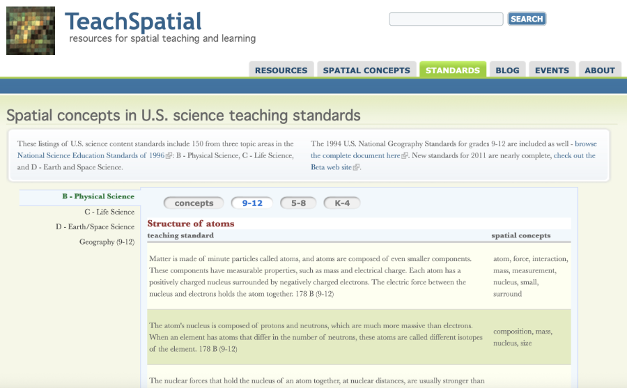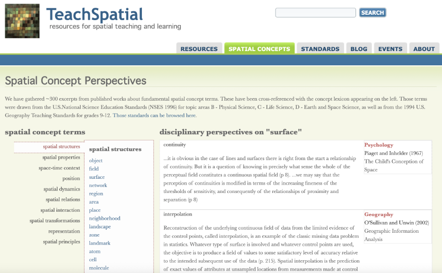 TeachSpatial was an NSF-funded initiative at UCSB aimed at strengthening spatial thinking and reasoning education across STEM and the social science subjects. PI Donald Janelle and I designed the conceptual and technical foundation of the project during its original development phase. We led a small working group in extracting spatial concepts embedded implicitly within the AAAS Benchmarks for Science Literacy. This analysis produced a controlled vocabulary of spatial constructs, ranging from geometric and topological ideas to spatial cognition, representation, and reasoning processes.