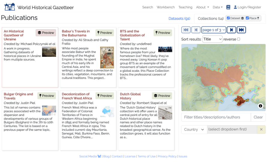 WHG’s web interface allows registered users to upload place datasets, augment them through reconciliation services, and publish them either as stand-alone datasets or as part of curated Collections. Collections enable rich, narrative-driven groupings of places with supporting images, links, and documents, and have emerging pedagogical value for world-historical inquiry.